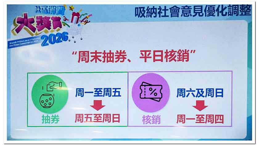 【本報訊】政府再推消費獎賞活動,「二○二六社區消費大獎賞」將於下月十日展開,為期十周。今期將抽券和核銷時序作出調整,改為「周末抽券、平日核銷」,即在周五至周日消費可以抽取電子優惠,並在周一至周四核銷抽中的優惠。此外,持殘評證人士改為透過「澳門通殘疾卡」領取額外的五百元消費立減優惠,無須再領取關愛卡。