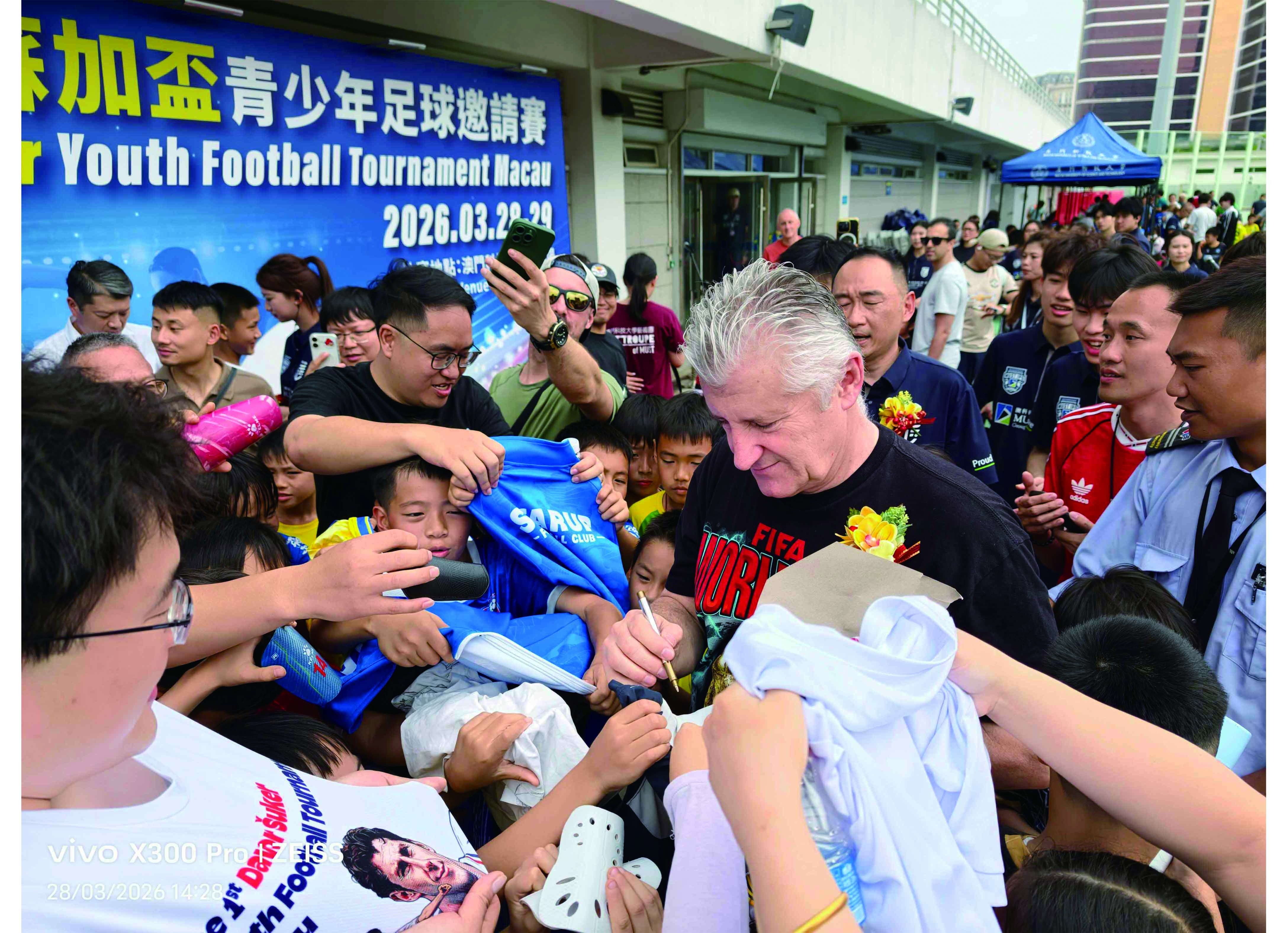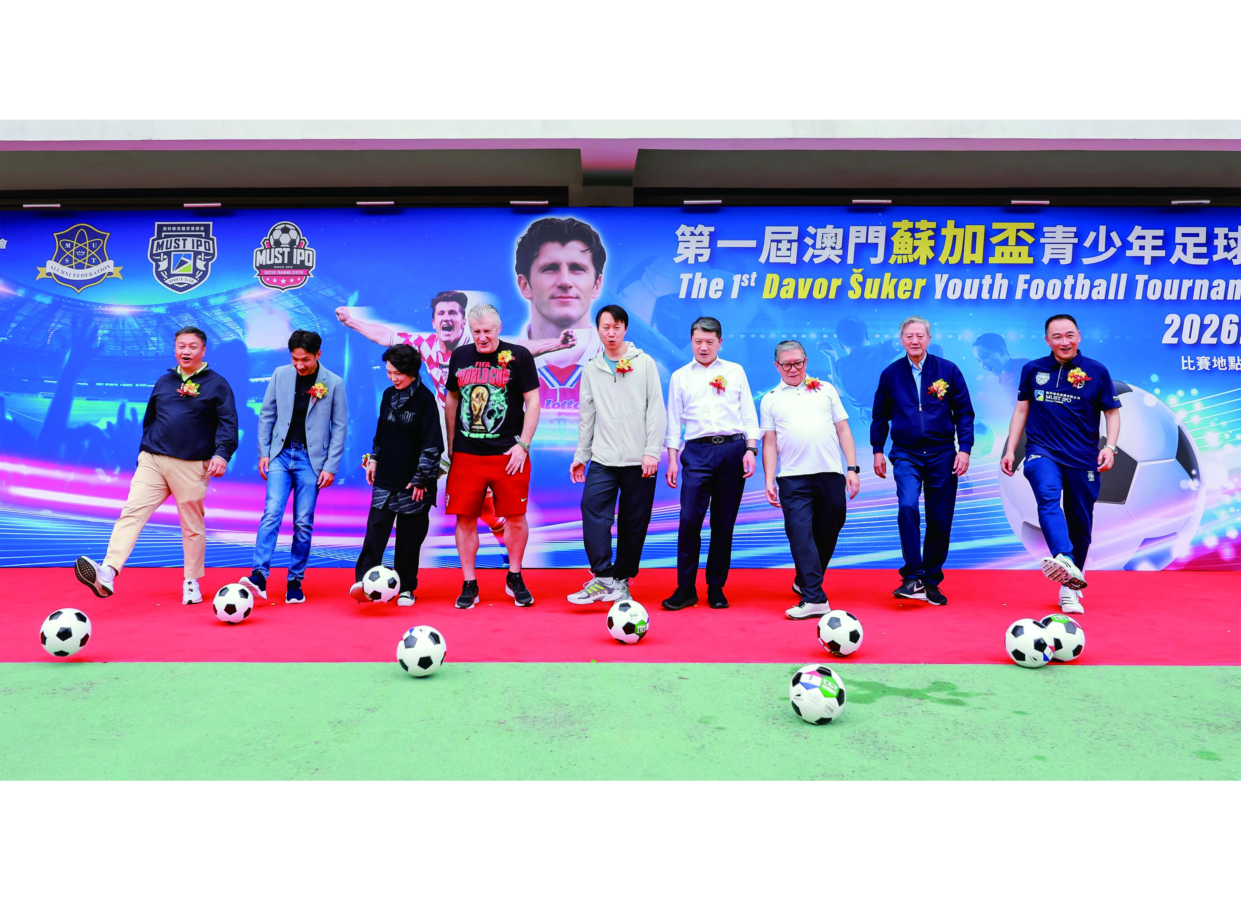 【本報訊】 由澳門科技大學校友會聯合總會、澳科精英體育發展會、以及澳科精英足球訓練中心聯合主辦,以Davor Šuker冠名「第一届澳門蘇加盃青少年足球邀請賽」於3月28日在澳門科技大學體育場舉行揭幕。克羅地亞足球傳奇、1998年世界盃金靴獎得主、2026年世界盃官方大使Davor Šuker達沃·蘇加親臨現場,為賽事主持開幕,是次活動比賽的球隊共有20隊逾四百人參加,氣氛熱鬧。