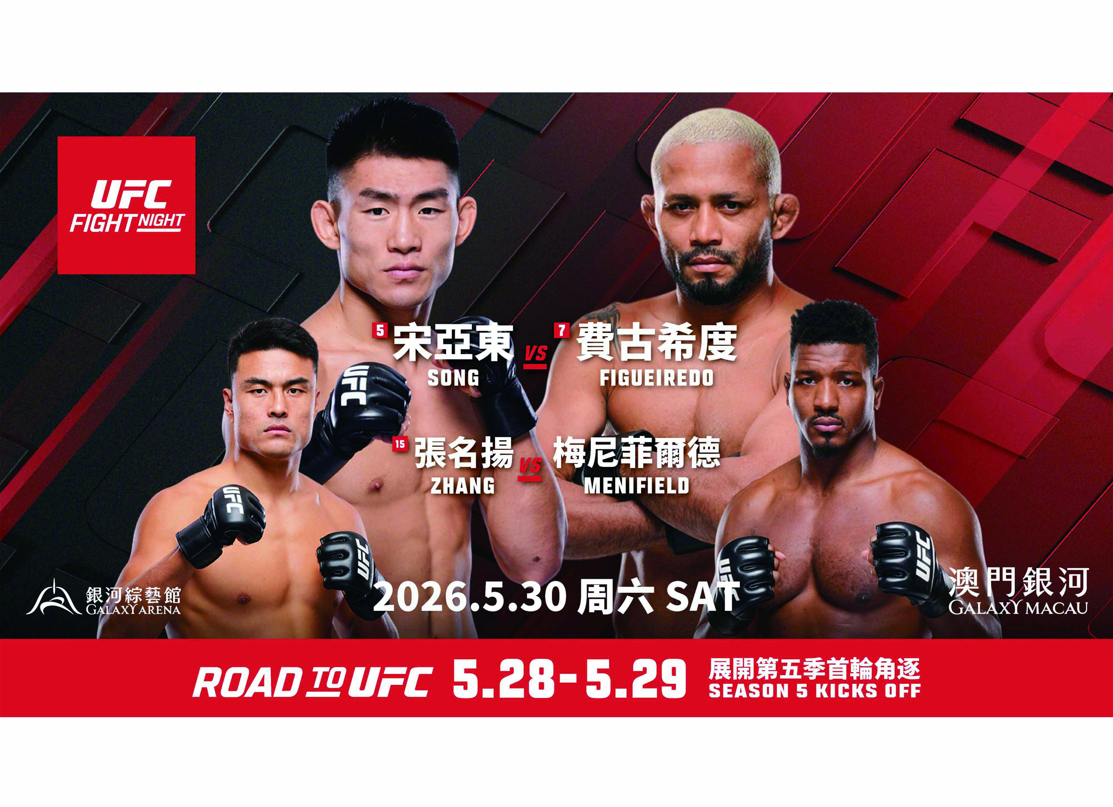 【特訊】「澳門銀河」熱烈宣佈,萬眾矚目的《UFC 格鬥之夜:宋亞東vs.費古希度》及《UFC 精英之路》第五季首輪賽事將於5月28-30日於澳門最大 的室內綜藝館銀河綜藝館正式上演,門票將於4月17日正式公開發售。本次賽事雲集世界知名綜合格鬥(MMA)明星及後起之秀,陣容星光熠熠。