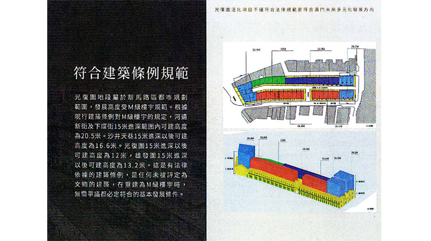 而「新馬路」被評定建築群,需保留外立面,但亦容許退縮後增加高度。光復圍鄰近的「綠豆圍」發展地段,獲准保留立面後,按七十六度角線退縮增加高度。基於合法、合理及公平原則,光復圍理應依法「獲得相應發展規劃條件。