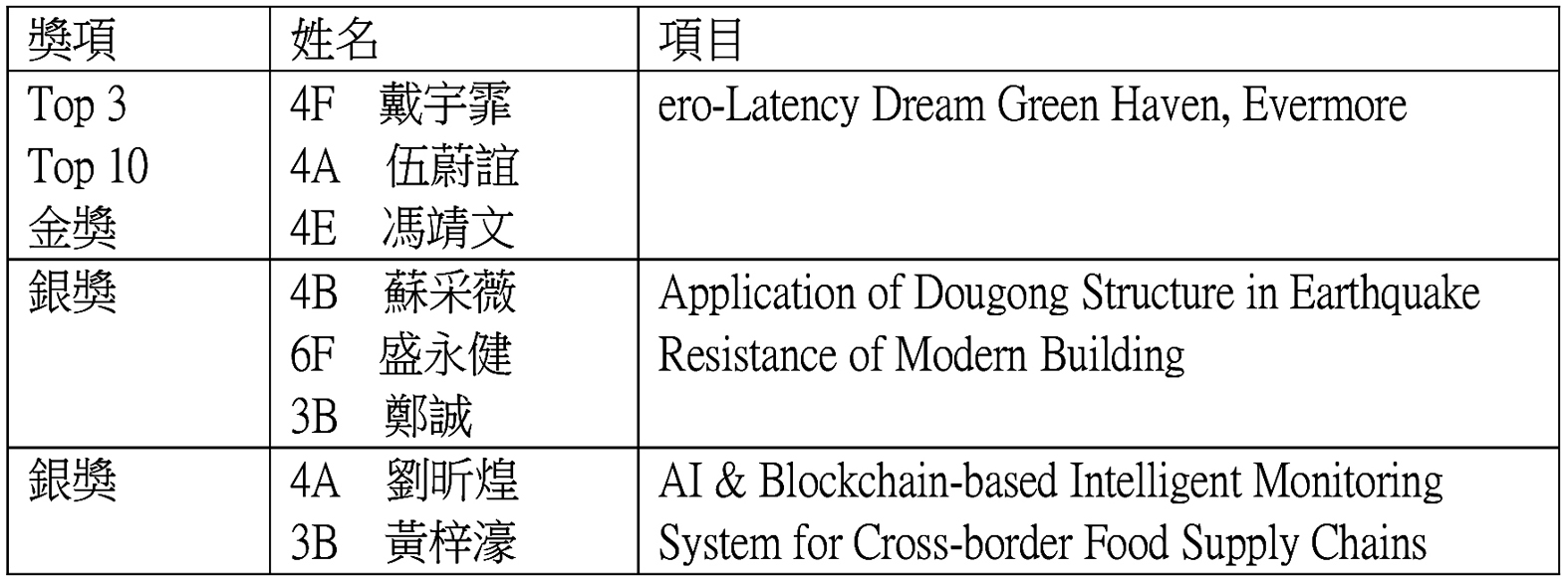 鏡平同學在首次參賽中,在首次參與賽事中便共獲得1金2銀的優異成績。而當中戴宇霏、伍蔚誼、馮靖文同學的項目獲得金獎的同時,入選本屆賽事中的Top 10名單,在經過Top 10項目的臨場即時答辯的激烈競爭後,她們最終獲選為全場Top 3的優異成績。