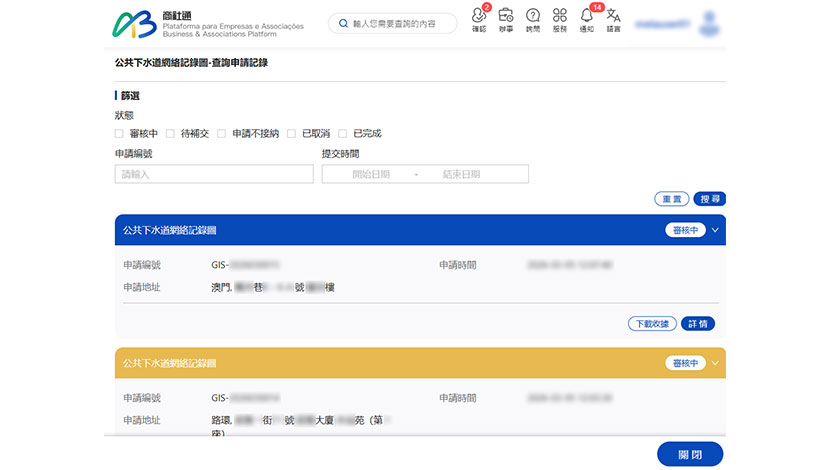 市民如需以線上方式進行申請,可透過網頁或手機應用程式登入商社通並選擇“公共下水道網絡記錄圖”服務,在填妥和上傳所需資料後確認並提交,即可完成申請手續。文件除了可透過親臨和電子方式領取外,亦支援“智取易”智能文件櫃自助領取。公共建設局在審批流程完成後會透過商社通通知領取文件,而申請人亦可於服務頁面內隨時追蹤申請進度及查閱所有申請紀錄。