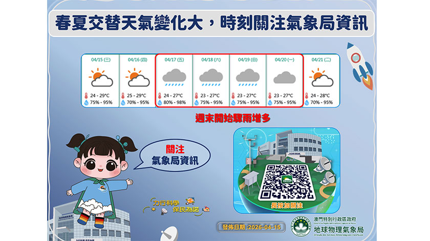 氣象局亦不忘推介該局近期推出的全新「澳門天氣App」 (體驗版),稱全新「澳門天氣App」 (體驗版) 進一步優化巿民獲取天氣資訊的體驗,提供更快捷的預警提示,以及更生活化的氣象服務,歡迎巿民下載體驗,並留意相關活動的消息。
