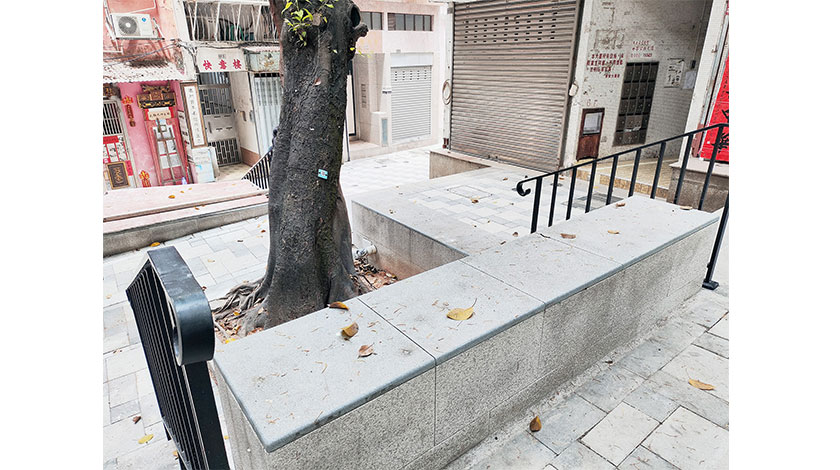 陸錦榮指出,重整後的快艇頭里周邊設有休憩座,但古樹周邊的座椅均沒有安裝靠背。考慮到該處環境存在明顯的高低落差,若長者或兒童在使用座椅時不慎後仰,可能存在安全風險。他建議當局優化座椅設計,加裝靠背以保障公眾安全。此外,步行梯級處存有兩個類似水池或花槽的設施目前處於閒置狀態,容易成為蚊蟲滋生的溫床,他期望當局明確設施具體用途,並盡早完成後續施工或填充,因應雨季到來,需加強周邊環境的化學滅蚊工作,避免淪為衛生死角。