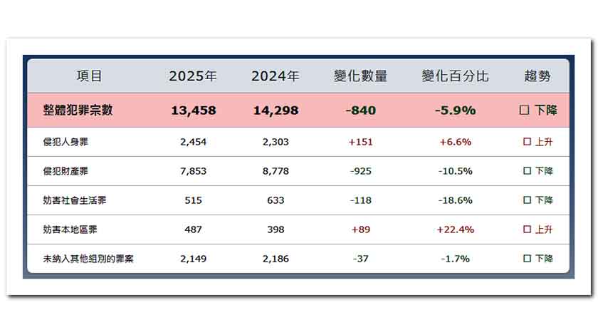【本報訊】保安司司長辦公室昨網上公布2025年本澳整體罪案數據,全年犯罪宗數共13458宗,較2024年下降5.9%,當中有5925人被拘留及送交檢察院處理,上升9.7%。保安司形容,去年總體治安態勢保持穩定良好,其中嚴重暴力犯罪、詐騙及電腦犯罪等社會關注的犯罪均呈下降趨勢,反映出警方各項預防打擊工作之成效,公眾的防罪意識普遍有所提高。