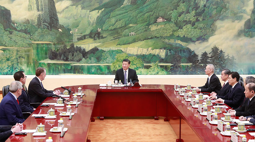 2月15日,中國國家主席習近平在北京人民大會堂會見來華進行新一輪中美經貿高級別磋商的美國貿易代表萊特希澤和財政部長姆努欽。(中新社圖片/盛佳鵬 攝)