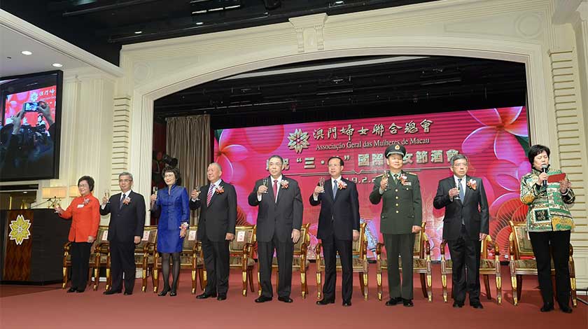 婦聯昨假萬豪軒舉行慶祝「三‧八」國際婦女節酒會,邀請行政長官崔世安、全國政協副主席何厚鏵、中聯辦主任傅自應、外交部駐澳特派員公署副特派員王冬、駐澳部隊政治工作部主任竇國杰、保安司司長黃少澤、運輸工務司司長羅立文等嘉賓出席。