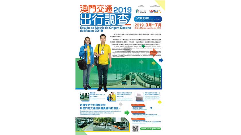 【特訊】2009及2014年,本澳進行了第一及第二次全澳居民交通出行調查,為制定交通政策和規劃提供了關鍵的基礎資料。時隔五年,交通事務局將於今年3月至7月開展「澳門交通出行調查2019」入戶調查,冀透過定期的調查收集本澳居民的交通出行習慣和特徵,以通過更有針對性的交通規劃和管理措施,提高居民的交通出行品質。