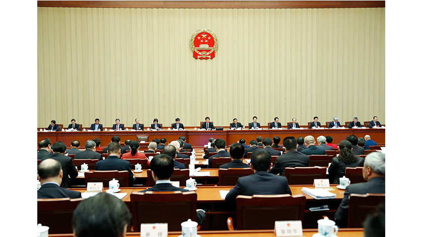 3月14日,十三屆全國人大二次會議主席團在北京人民大會堂舉行第三次會議。主席團常務主席栗戰書主持會議。 (中新社圖片/劉震 攝)