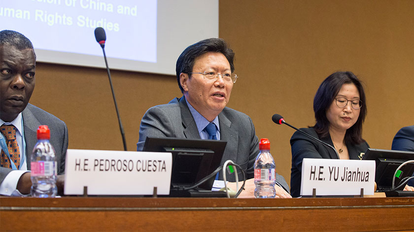 『新疆人權事業發展成就』主題邊會在日內瓦舉行 3月13日,在瑞士日內瓦,中國常駐聯合國日內瓦辦事處和瑞士其他國際組織代表俞建華(中)在『新疆人權事業發展成就』主題邊會上發言。 在聯合國人權理事會第40次會議舉行期間,中國常駐聯合國日內瓦代表團和中國人權研究會聯合在日內瓦舉行『新疆人權事業發展成就』主題邊會,從歷史、現實和法律等角度全面介紹新疆真實情況,並集中澄清一些不實信息。(新華社記者徐金泉攝)