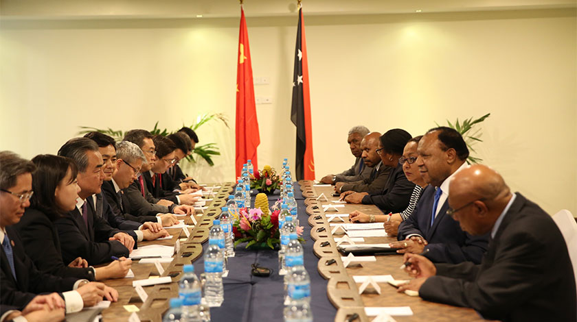 10月31日,中國國務委員兼外交部長王毅在莫爾斯比港與巴布亞新几內亞外長帕托舉行會談。(中新社圖片/ 陶社蘭 攝)