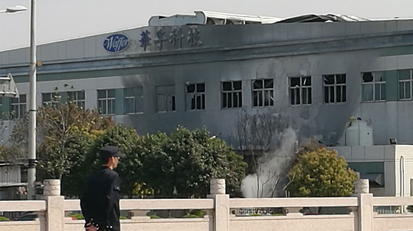 3月31日上午7時12左右,江蘇昆山綜保區漢鼎精密金屬有限公司加工中心車間室外場地上存放廢金屬的一個集裝箱發生一起燃爆,引起車間起火,導致7人死亡,1人重傷,4人輕傷。據昆山官方發佈通報,截至上午10時許,事故現場清理完畢。事故原因正在調查中。圖為事發地車間牆壁上留下印記。(中新社圖片/ 鍾升 攝)