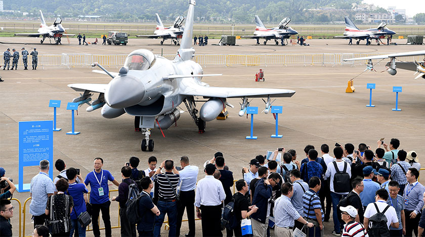 11月6日,第十二屆中國國際航空航天博覽會在珠海開幕。中國人民解放軍八一飛行表演隊、空軍航空大學『紅鷹』飛行表演隊、殲-20戰機等多機種精彩上演。圖為殲—10B機型展示。(中新社圖片/ 陳文 攝)