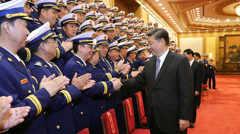 11月9日,國家綜合性消防救援隊伍授旗儀式在人民大會堂舉行。中共中央總書記、國家主席、中央軍委主席習近平向國家綜合性消防救援隊伍授旗並致訓詞。授旗儀式後,習近平等親切接見國家綜合性消防救援隊伍總隊級以上幹部。(新華社記者 鞠鵬 攝)