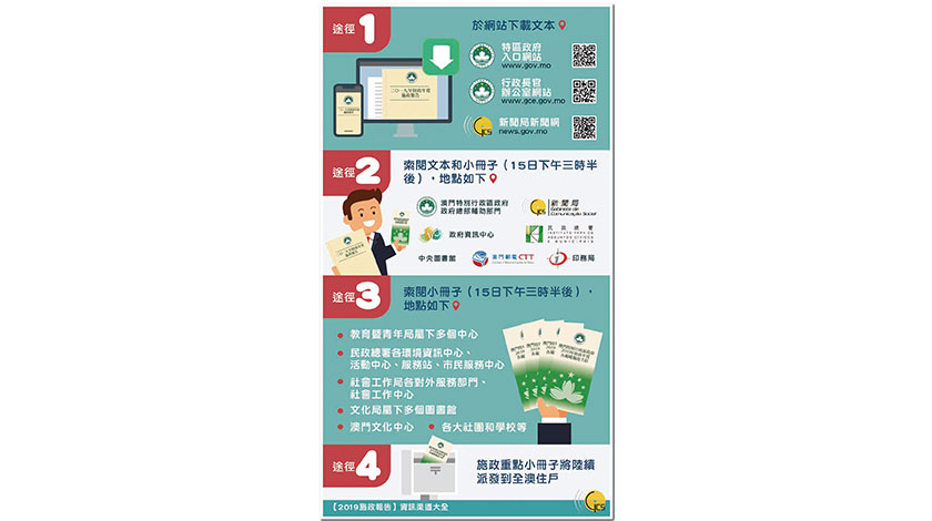 至於施政報告的文本和小冊子(中、葡文版本),公眾可於15日下午三時半到以下地點備索:政府總部輔助部門、新聞局、政府資訊中心、民政總署大樓、中央圖書館、郵電局及印務局等。市民亦可前往多個網點索閱施政小冊子,包括:教育暨青年局屬下多個中心;民政總署各環境資訊中心、活動中心、服務站、市民服務中心;社會工作局各對外服務部門、社會工作中心;文化局屬下多個圖書館、澳門文化中心,以及各大社團和學校等。此外,郵電局會陸續將施政重點小冊子派發到全澳住戶。