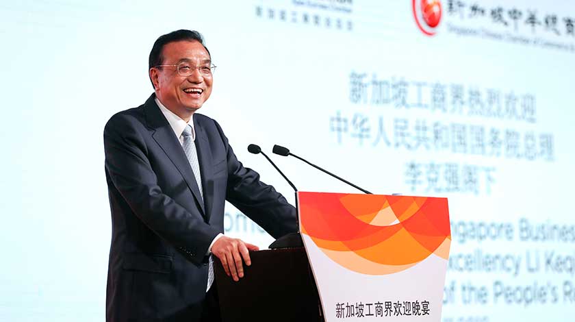 當地時間11月13日晚,中國國務院總理李克強在新加坡出席新加坡工商聯合總會和中華總商會聯合舉辦的歡迎晚宴並致辭。 (中新社圖片/ 劉震 攝)