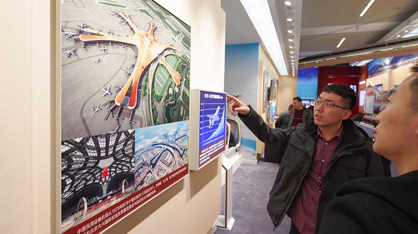 11月14日,觀眾在“偉大的變革——慶祝改革開放40周年大型展覽”上觀看北京大興新機場建設介紹。11月13日,“偉大的變革——慶祝改革開放40周年大型展覽”在國家博物館開幕。 (中新社圖片/ 賈天勇 攝)