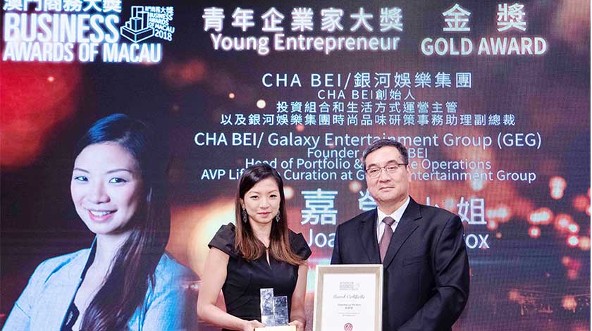 「澳門商務大獎 2018」評審團由 30 位成員組成,包括多位具代表性的知名企業家、銀行家、學者及專業人士等,當中「青年企業家大獎」旨在表彰 40 歲以下的青年企業家所取得的成就及其過人的創業精神。2016 年,呂嘉瑩於「澳門銀河」創辦結合零售、餐飲及互動空間的 CHA BEI,該項目自開業以來備受各界好評,更一躍成為城中的熱門地點,至今獲得多項殊榮。除此之外,她亦透過其創意的視野,協助集團優化零售文化及客人體驗,成功為銀娛的非博彩元素增造一個新領域,是次獲頒「青年企業家大獎」金獎,實至名歸。