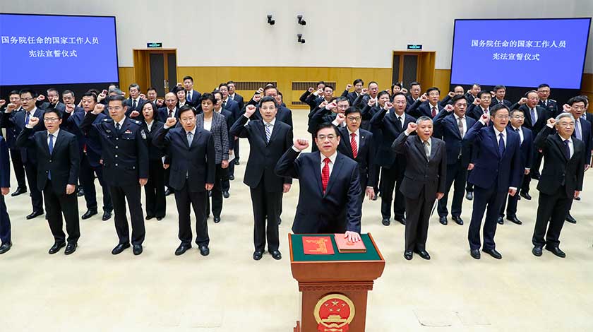 11月20日,國務院在北京中南海舉行憲法宣誓儀式。國務院總理李克強監誓。根據《中華人民共和國憲法》和《國務院及其各部門任命的國家工作人員憲法宣誓組織辦法》,2018年4月至10月國務院任命的40個部門和單位的59名負責人依法進行憲法宣誓。 (中新社圖片/ 劉震 攝)