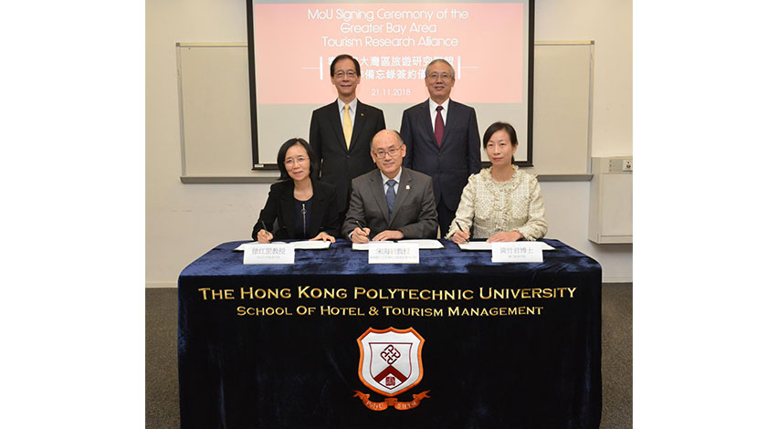 備忘錄簽約儀式於前日在香港理工大學舉行,旅遊學院院長黃竹君、香港理工大學酒店及旅遊業管理學院署理院長宋海岩教授、中山大學旅遊學院院長徐紅罡代表所屬院校簽署。香港理工大學唐偉章校長及中山大學羅俊校長在場見證。