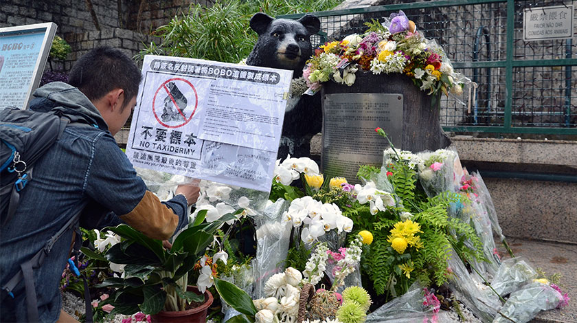 【本報訊】前日,民政總署突然證實,把黑熊 BOBO 製成標本的工作已在兩、三天前開始。昨日,從事環保教育的陳俊明等人冒雨到二龍喉公園的 BOBO 熊舍外放上植物、展示「不要標本」的海報,並且鞠躬。他受訪時坦言,對民署的手法感到愕然,甚至覺得被欺騙:一方面呼籲公眾理性討論,另一方面迅速暗地落實長官意志,這做法看來是不想爭拗持續下去。