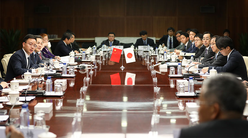 4月3日,第13次中日經濟夥伴關係磋商副部級會議在北京舉行。中國商務部稱,雙方就世界及兩國宏觀經濟形勢,《區域全面經濟夥伴關係協定》(RCEP)、中日韓自貿區等區域及多邊合作議題交換了意見。(中新社圖片/ 趙隽 攝)