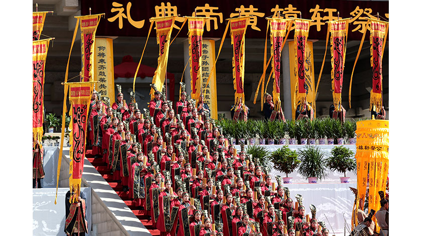 4月5日,演員在公祭軒轅黃帝典禮上表演黃帝祭典樂舞告祭。當日,己亥(2019)年清明公祭軒轅黃帝典禮在陝西黃陵縣黃帝陵舉行,萬餘名海內外華夏兒女共祭中華民族人文初祖軒轅黃帝。 (中新社圖片/ 張遠 攝)