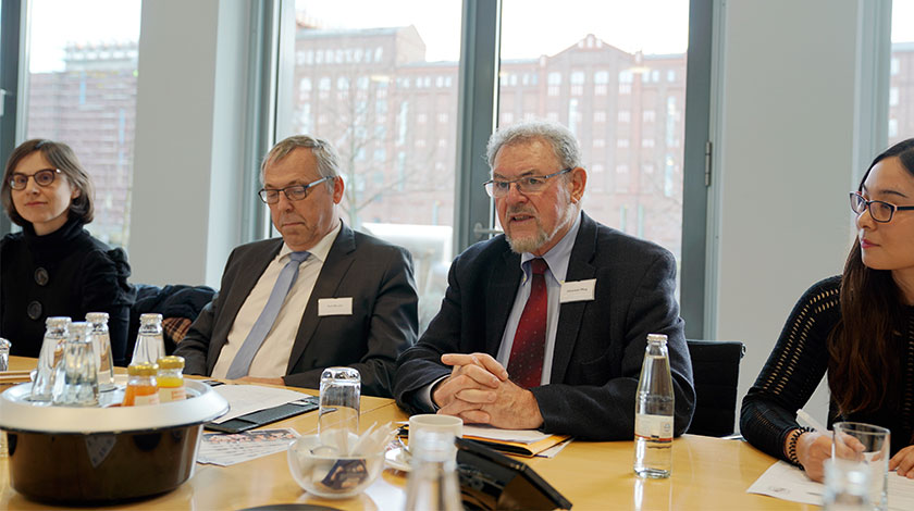 『煤炭』曾經是德國魯爾區的關鍵詞。經歷轉型陣痛,魯爾區重新煥發了生機。2018年12月21日,位於魯爾區的德國境內最後一座石煤礦正式關閉。空氣清新,河水潔淨。中新社記者今年3月在杜伊斯堡看到,人們印象中那個灰蒙蒙的魯爾區早已成為歷史。圖為中新社記者近日前往杜伊斯堡採訪時與德國聯邦議院中德議員友好小組前主席、杜伊斯堡市政府中國事務專員約翰內斯•普弗魯克(右二)等該協會主要成員座談。(攝于3月5日)(中新社圖片/ 彭大偉 攝)