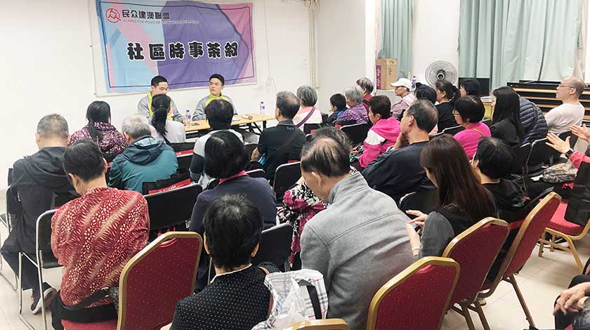 【特訊】日前,民眾建澳聯盟舉辦每月社區時事茶敍,與居民探討政府施政及社區問題,共四十多名居民參與。民建聯理事長兼市諮委李良汪、常務理事兼離島社諮委吳超偉出席,總結早前已處理及跟進的問題,並聆聽及收集居民對修改“經屋法”、都市更新、內港防洪工程、巴士候車環境、公共衛生、市政建設,以及休憩區設施等多方面的意見。