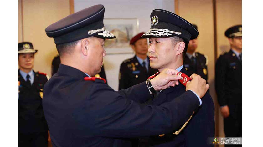【特訊】4月8日,治安警察局黃偉鴻警務總長正式就任為副局長,並獲授予副警務總監之警銜。就職儀式於上午假治安警察局總部舉行,由治安警察局梁文昌局長主持,各領導及部門主管出席見證。