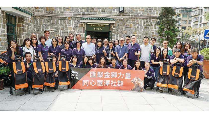 4月6 日,美高梅管理層帶領義工隊員到訪仁慈堂社服店,獲澳門仁慈堂值理會主席飛安達熱情款待。在其他受惠機構代表澳門街坊會聯合總會會長梁慶球和澳門工會聯合總會監事長梁玉華的見證下,美高梅人力資源副總裁趙翠華代表公司送交澳門幣三十萬元善款支票,由飛安達代表接收。