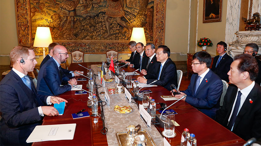 當地時間4月9日上午,中國國務院總理李克強在布魯塞爾埃格蒙宮會見比利時首相米歇爾。(中新社圖片/ 劉震 攝)