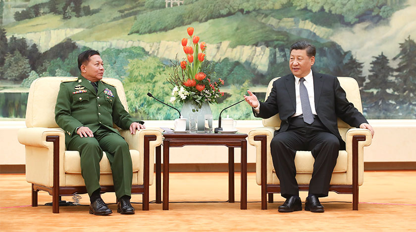 4月10日,中國國家主席習近平在北京人民大會堂會見來華訪問的緬甸國防軍總司令敏昂萊。(中新社圖片/ 盛佳鵬 攝)