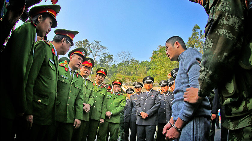 11月26日上午,中國警方在廣西憑祥友誼關零公里處向越南警方移交越南國際紅通在逃毒販農文起。農文起是一名『90後』越南毒梟,曾參與策劃將288塊重約100.8公斤的毒品海洛因,從老撾經越南邊境山蘿省販運進入越南,再伺機走私到中國販賣等多起毒品案件。(中新社圖片/ 警方供圖 攝)