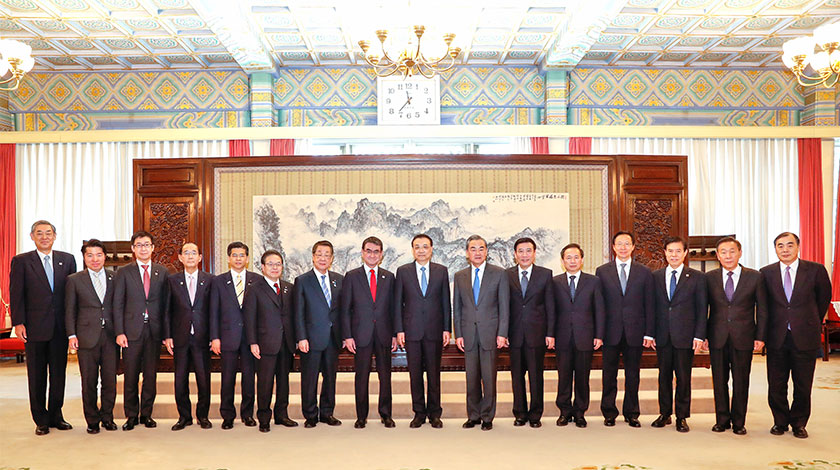 4月15日,中國國務院總理李克強在北京中南海紫光閣會見出席第五次中日經濟高層對話的日本外相河野太郎以及部分日本政府內閣成員。 (中新社圖片/劉震 攝)