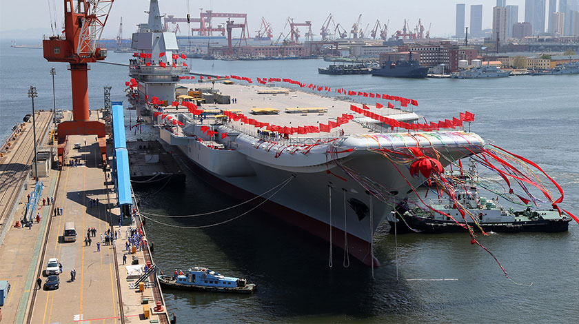 裝備更新換代 中國海軍的『五虎上將』從早期的『小艇打大艦』到如今艦載戰鬥機從遼寧艦甲板起飛,武器裝備的發展成為觀察人民海軍70年曆程的窗口。從五大兵種的角度觀察,中國海軍『五虎上將』的『兵器』日漸精良。圖為中國第二艘航空母艦下水。(中新社圖片/ 李唐 攝)