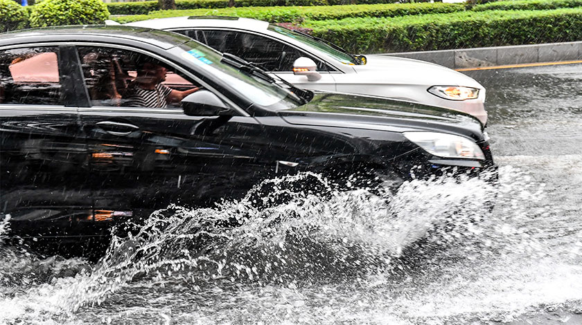 廣州街頭路面出現積水,車輛涉水前行。 (中新社圖片/ 陳驥旻 攝)