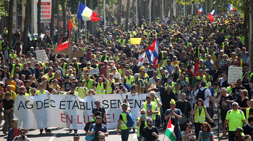當地時間4月20日,巴黎再次發生大規模示威,並伴隨暴力衝突。巴黎聖母院本周遭遇的大火,沒有令示威者的步伐停止,有9000人參與當天的示威。數以千計示威者從貝爾西車站前往共和國廣場。(中新社圖片/ 李洋 攝)