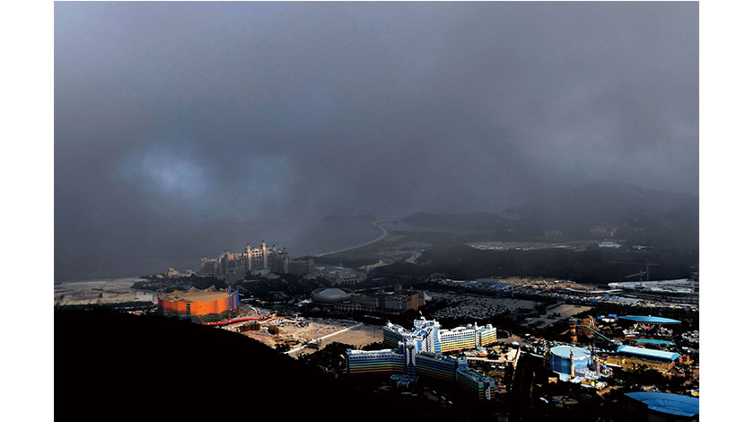 4月22日,珠海橫琴新區天氣炎熱,雲霧繚繞,忽而天色轉暗,忽而雲開霧散,變化無窮。圖為在珠海腦背山上俯瞰珠海橫琴長隆國際海洋度假區。(中新社圖片/ 姬東 攝)