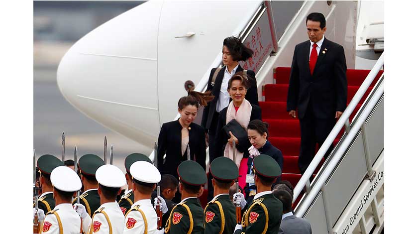 4月24日,來華出席第二屆“一帶一路”國際合作高峰論壇的緬甸國務資政昂山素季抵達北京。 (中新社圖片/ 富田 攝)