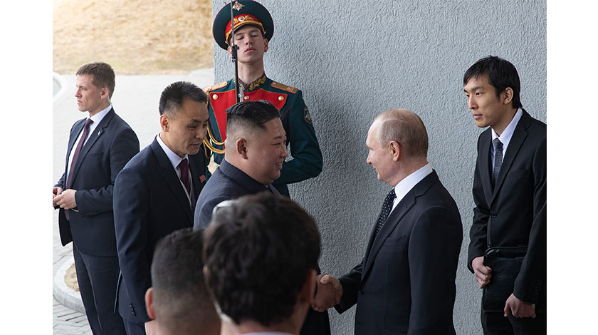 新華社雷德里沃斯克2019年4月25日電俄羅斯總統弗拉基米爾•普京(第二輪)於2019年4月25日在俄羅斯符拉迪沃斯托克會見朝鮮民主主義人民共和國(朝鮮)金正恩的最高領導人。弗拉基米爾•普京和金正日 週四,Jong Un在俄羅斯島的遠東聯邦大學開始了他們的會議。(新華社/白雪琪)