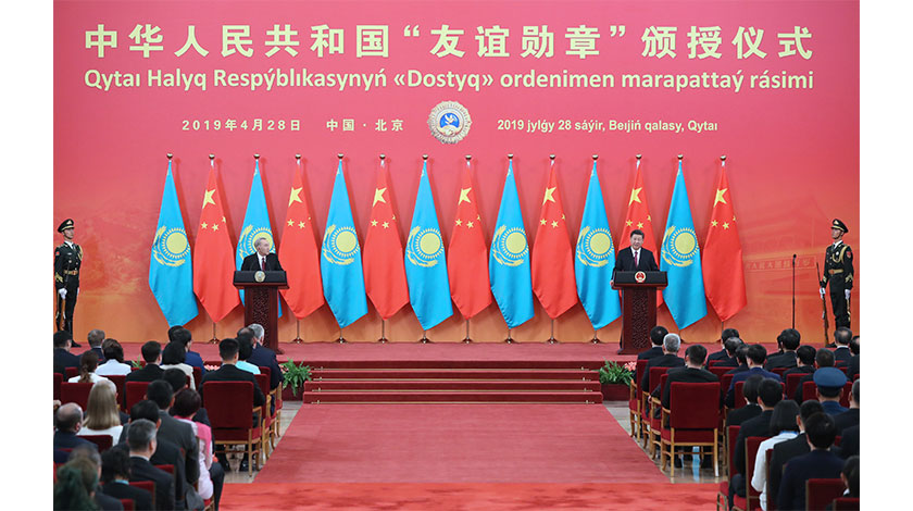 2019年4月28日 習近平為哈薩克斯坦首任總統納扎爾巴耶夫舉行『友誼勛章』頒授儀式 4月28日,國家主席習近平在北京人民大會堂中央大廳為哈薩克斯坦首任總統納扎爾巴耶夫舉行『友誼勛章』頒授儀式。 (新華社記者 鞠鵬 攝)