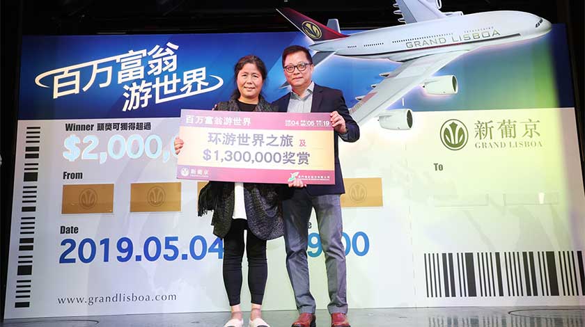 「百萬富翁遊世界」大抽獎於5月4日晚上7時假新葡京紅金層大舞台舉行,共抽出五位幸運會員上台玩遊戲,爭奪成為頭獎得主。經過一輪緊張刺激的遊戲後,吳女士在參加者中脫穎而出,成為大贏家;另外四位幸運兒各獲贈港幣38000元獎賞。頒獎儀式隨即舉行,由澳門博彩股份有限公司業務總監葉澤遠先生頒贈獎品予頭獎得主。