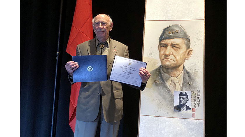 當地時間5月11日晚,飛虎隊老戰士邁爾文•麥克穆倫(Melven McMullen)獲頒賀狀,表彰其在二戰期間援華抗戰的英勇事跡。為期兩天的第四屆『中美二戰友誼暨飛虎隊歷史論壇』,當晚在美國內華達州拉斯維加斯落幕。本次論壇主題為『父輩的旗幟』,由中國人民對外友好協會和美國航空遺產基金會舉辦,與會中美各界人士共同慶祝兩國建交40周年。(中新社圖片/ 張朔 攝)