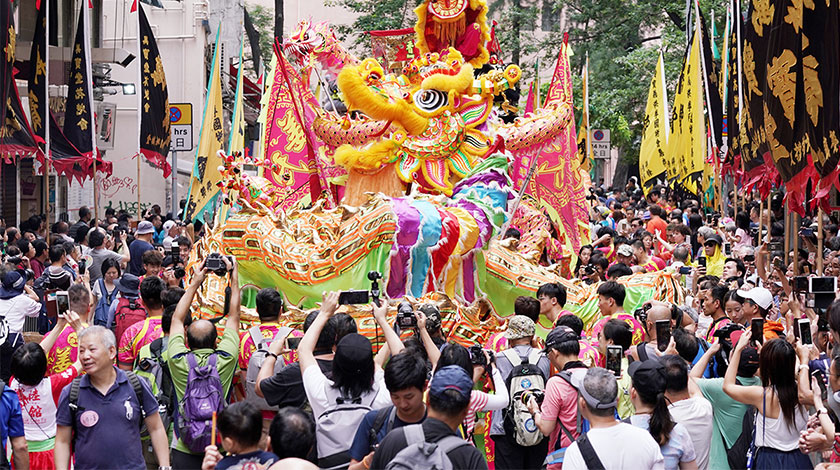 5月12日(農曆四月初八),香港本地傳統民俗——慶祝“譚公誕”巡遊活動在筲箕灣舉行。鑼鼓喧天,彩旗招展,數十支遊行隊伍從筲箕灣東大街出發,沿途龍飛獅舞,吸引眾多市民和遊客夾道觀看。遊行隊伍最終到達筲箕灣譚公廟,眾多善男信女向海上守護神譚公燒香膜拜,祈求來年平安豐收。圖為巡遊隊伍場面壯觀。 (中新社)