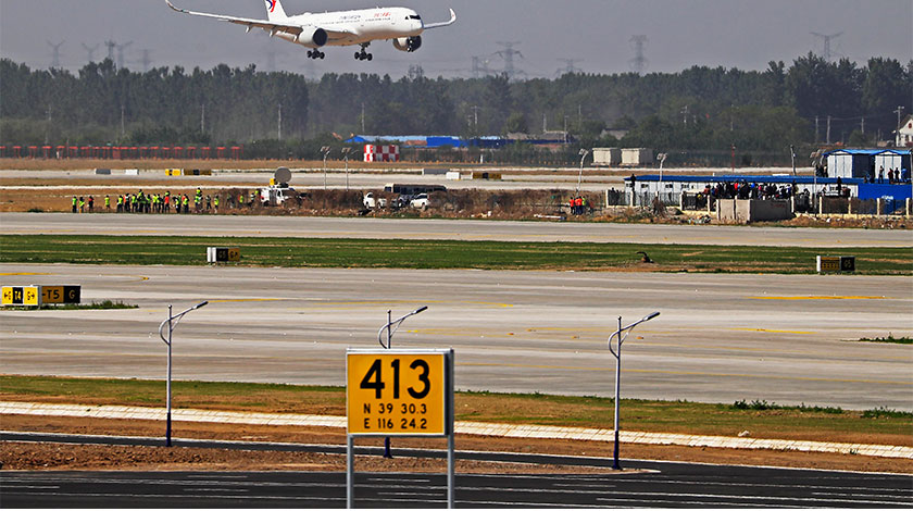 5月13日9時35分,一架塗著東航淩燕航徽、有著『墨鏡俠』之稱並搭載著全球最先進客艙服務系統的A350-900客機平穩降落在北京大興國際機場的跑道上。這標誌著作為主基地航空公司之一的東航,完成了北京大興國際機場的首輪驗證試飛任務,邁出投運北京大興國際機場的堅實一步。北京大興國際機場是『國家發展新的動力源』『首都的重大標誌性工程』。圖為東航A350-900客機準備降落在北京大興國際機場的跑道上。(中新社圖片/殷立勤 攝)