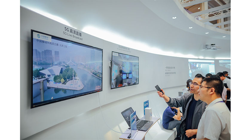 5月16日,觀眾觀看中國移動5G高清直播。當日,第三屆世界智能大會在天津開幕。 (中新社圖片/ 佟郁 攝)