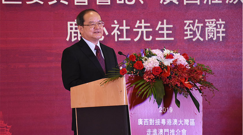 廣西自治區黨委、自治區人民政府昨在金沙城舉行「二零一九廣西對接粵港澳大灣區——走進港澳系列活動之澳門推介會」,鹿心社、代特首梁維特、中聯辦主任傅自應、立法會主席賀一誠等約三百人出席。