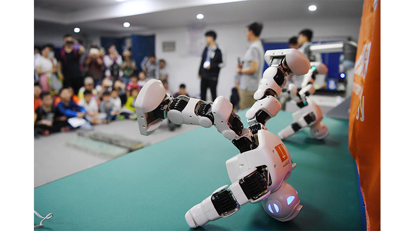 5月19日,2019年中國科學技術大學科技周活動在合肥舉行。中國科大國家同步輻射實驗室、火災科學國家重點實驗室等多個實驗室和科普點對市民開放,讓市民近距離『探秘』科技的魅力。圖為小科技迷觀看機器人舞蹈表演。 (中新社圖片/韓蘇原 攝)