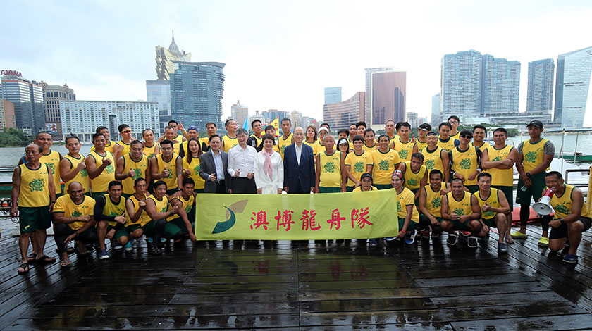 澳博昨日下午假南灣湖水上活動中心,舉行龍舟隊下水禮,由澳博董事蘇樹輝、澳博常務董事及行政總監兼福諮會主席梁安琪、娛樂場運作營運總監郭維紀、龍舟隊領隊霍志釗等為澳博龍舟隊主持下水禮。澳博今年組織了九隊龍舟隊參加澳門龍舟賽中的標準龍及小龍舟賽事,賽事將在下初舉行。